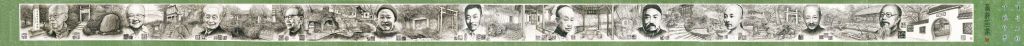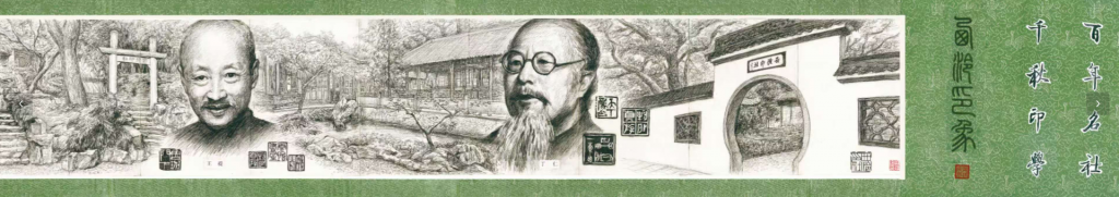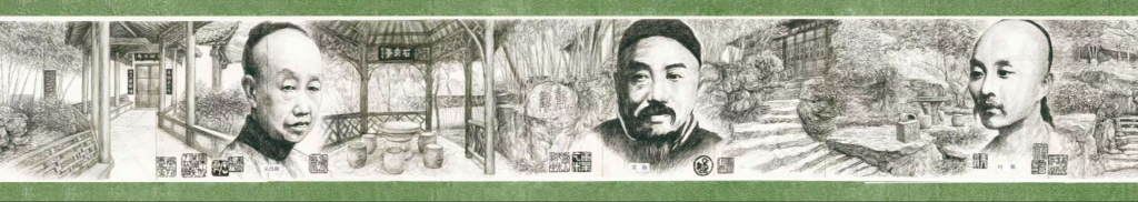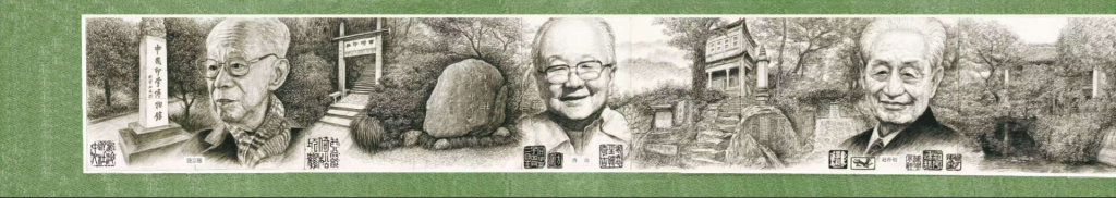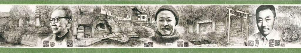 首先,作品采用了长卷式构图,这种形式本身就极富传统韵味,常见于中国山水画或历史题材绘画之中。孙老师以西泠印社为核心,将不同历史人物的肖像与实景建筑、山水园林相结合,使画面不仅具有极强的连贯性,也增强了叙事性。观者在欣赏的过程中,仿佛置身于西泠的文化长河之中,逐步感受到这片土地的厚重与深远。