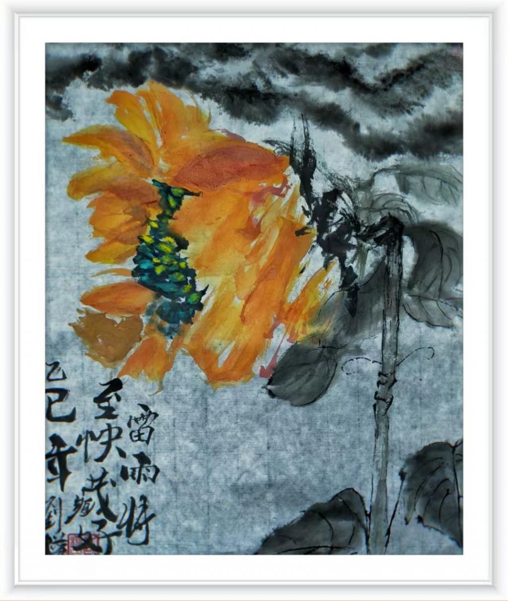 从整体构图来看,刘权老师巧妙地通过花朵与背景的对比,展示了大自然的力量与美丽。画面中央的向日葵以饱满的色彩呈现,鲜艳的黄色和橙色使得花朵在画面中十分突出,生动有力,仿佛充满了生命力。而画面上方的乌云与阴霾背景,则与花朵的明亮形成了鲜明的对比,突显了“风雨前的守候”这一主题。背景的墨色渐变以及云雾的处理,让人感受到一种即将来临的风雨的气氛,同时也暗示了人们在困境前的坚韧与坚持。