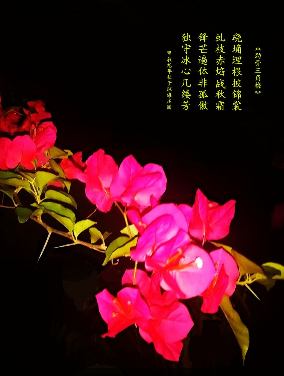 《劲骨三角梅》 硗埆埋根披锦裳, 虬枝赤焰战秋霜。 锋芒遍体非孤傲, 独守冰心几缕芳。
