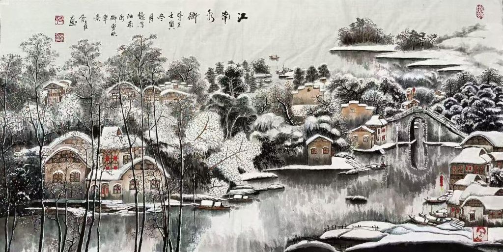 而最令人感动的,莫过于作品中体现出的生活情味。小桥流水、炊烟袅袅、人舟相伴,屋前洗衣、湖上渔歌,这些细节无不透露出对生活的热爱与眷恋,正如题目所言——“家在青山绿水间”,这是对“天人合一”理想境界的温柔诠释,也是一种质朴但深远的东方美学表达。
