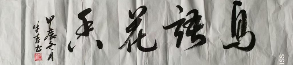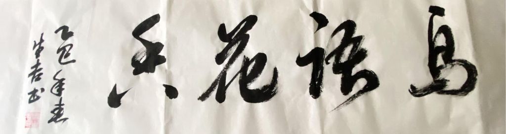 不过,在欣赏这幅作品的同时,也能看到一些可以进一步完善的地方。比如,字形的起笔和收笔的过渡部分,有时稍显生硬,尽管整体的流畅度已经很好,但在一些细节处,若能在用笔的转折上更加自然圆润,可能会使作品更加和谐。再者,若能在“鸟语”两个字的衔接上稍作调整,让笔画之间的过渡更为柔和,或许能够更好地体现出“鸟语”的灵动和自由。