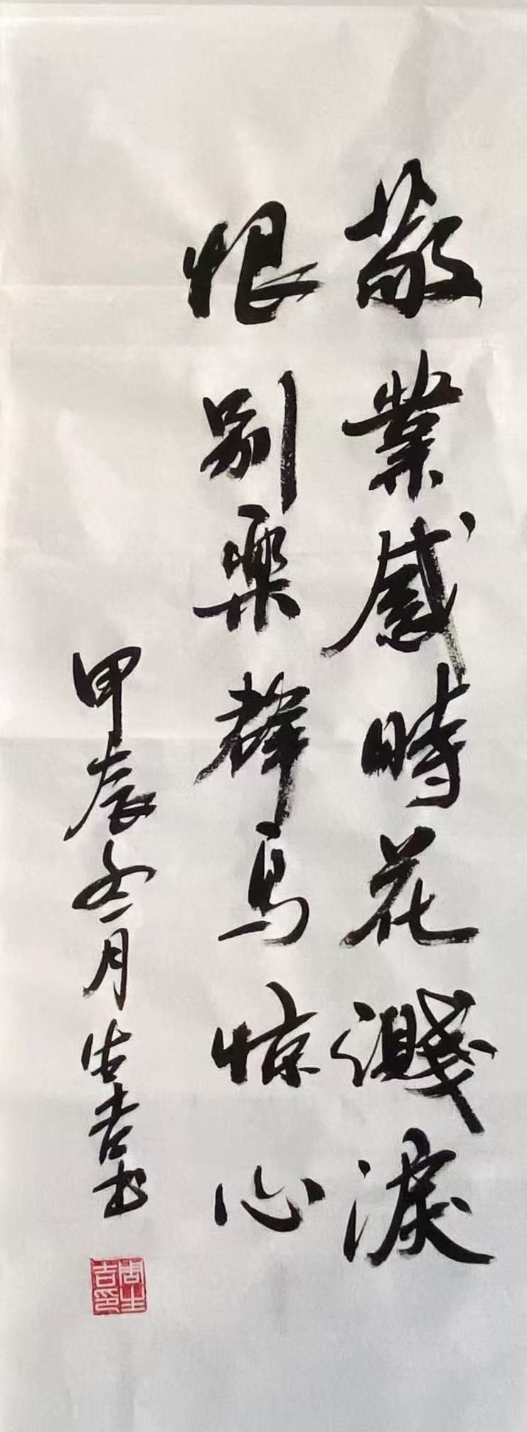 首先,从作品的字形来看,周生吉老师采用了行书的形式,笔画之间相互呼应,既不失行书的奔放,又充满了艺术的优雅。特别是在“鸟”和“香”这两个字上,字形处理极具个性,笔画有力而流畅,字形稳中带动,显示出作者深厚的书法功力。整体用笔奔放有力,笔画的起承转合自然流畅,似乎每一笔都在诉说着大自然的生动与灵动。
