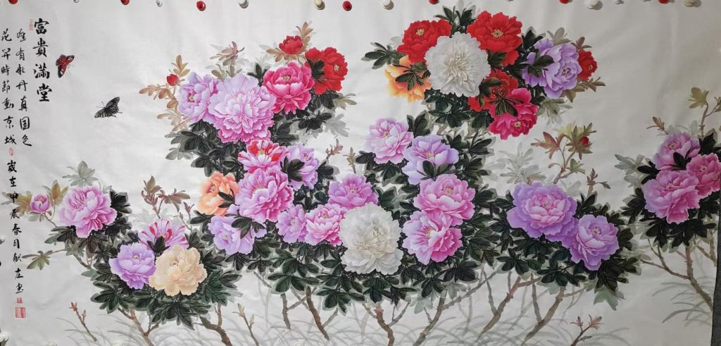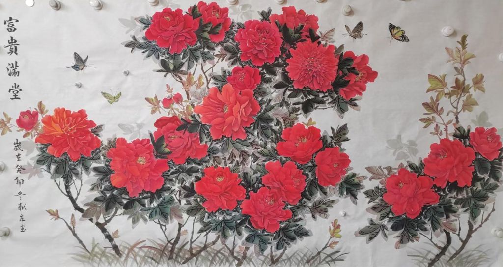 首先,从整体的构图来看,杨老师巧妙地将多株盛开的牡丹花巧妙地交织在一起,形成一个富有层次感的画面。每朵牡丹花都绽放得恰到好处,色彩饱满,形态生动,富有生命力。整体的布局既不失对称,又有一些微妙的变化,使得画面既充满了生动的动感,又具备了一种和谐的视觉效果。通过花朵的大小、花色的搭配,杨老师成功地表达了“富贵”二字的含义,整个作品透露出一种繁荣、富贵的气息。