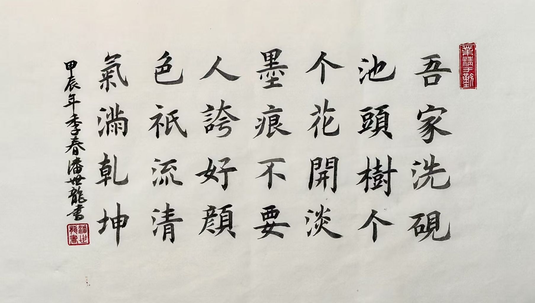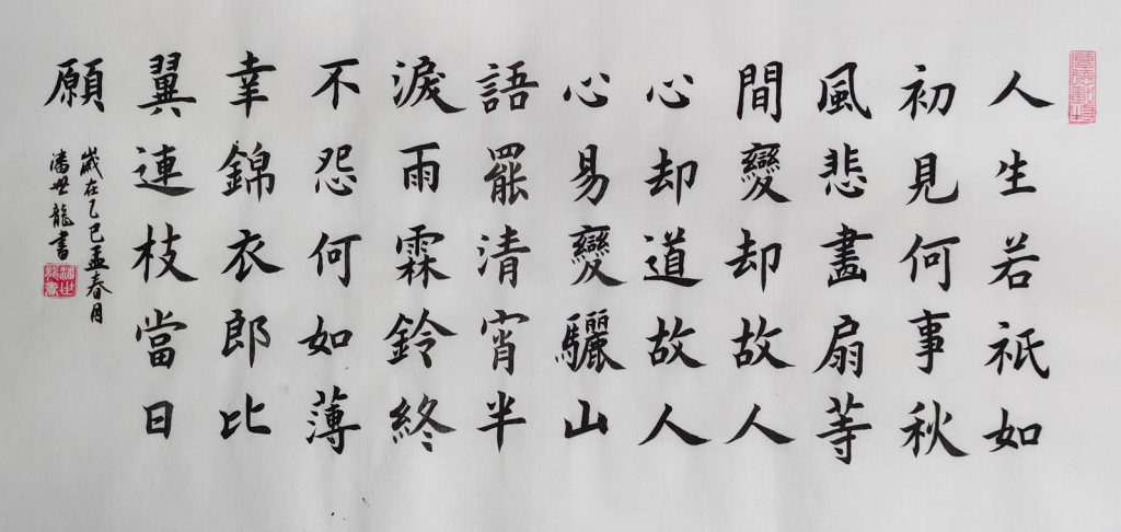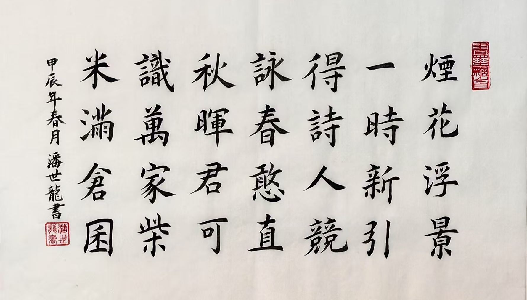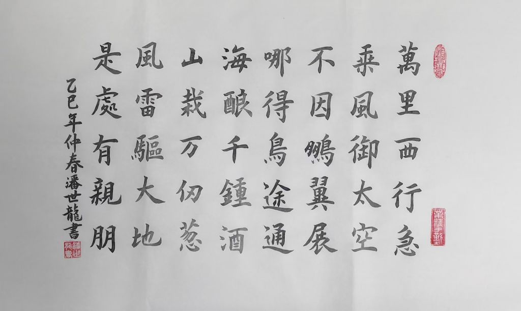 潘世龙自幼便对翰墨丹青展现出浓厚的热爱,即便在早期缺乏专业师承的情况下,他也始终坚持笔耕不辍,对书法艺术的追求从未间断。2014年,一次偶然的机会,他接触到书坛名家田蕴章先生的《每日一题·每日一字》系列讲座,深受启发,仿若醍醐灌顶。自此,他立下“百日筑基”的宏愿,系统地开展了为期365日的专题训练,为自己的书法学习奠定了坚实基础。此后,潘世龙潜心钻研田英章先生的碑帖体系,广泛临摹《九成宫醴泉铭》《虞恭公碑》《化度寺碑》《皇甫诞君碑》《千字文》等欧楷经典之作,同时兼修《兰亭序》等行书,至今已在书法研习之路上走过了十余载。